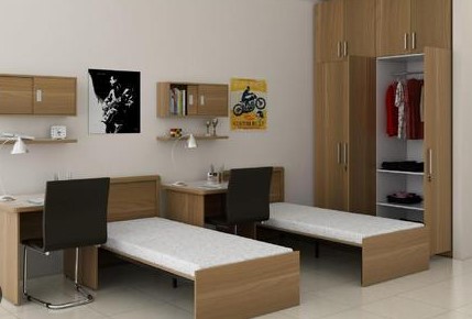 A Cot, Study Table, Chair & A Cupboard For Each Occupant.